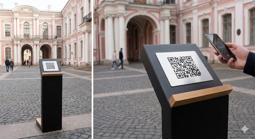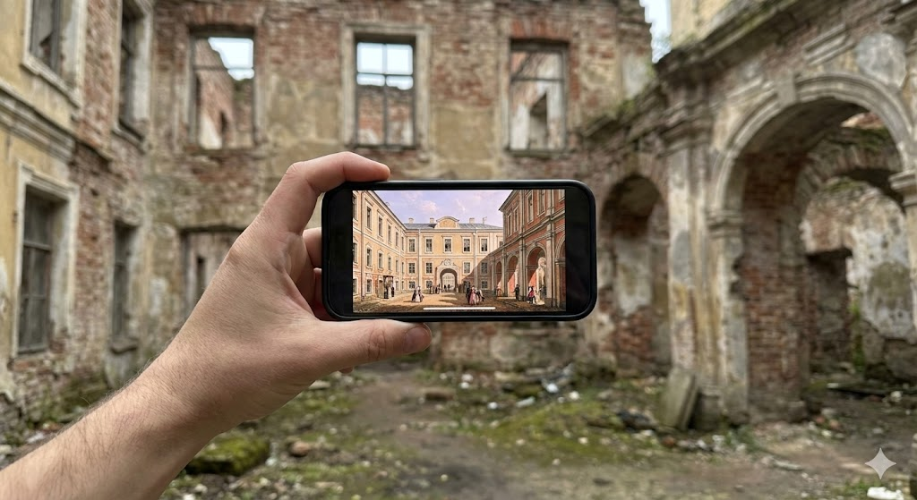 Посетитель находится на локации и через смартфон видит цифровой слой: панорамы, реконструкции, ожившие объекты, аудиогид и интерактивные метки.